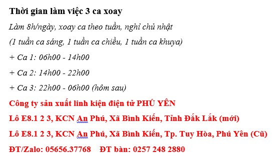 🍀 Thời gian làm việc: 3 ca xoay (ca 1: 06 – 14h, ca 2: 14 – 22h, ca 3: 22-06h) chủ nhật nghỉ